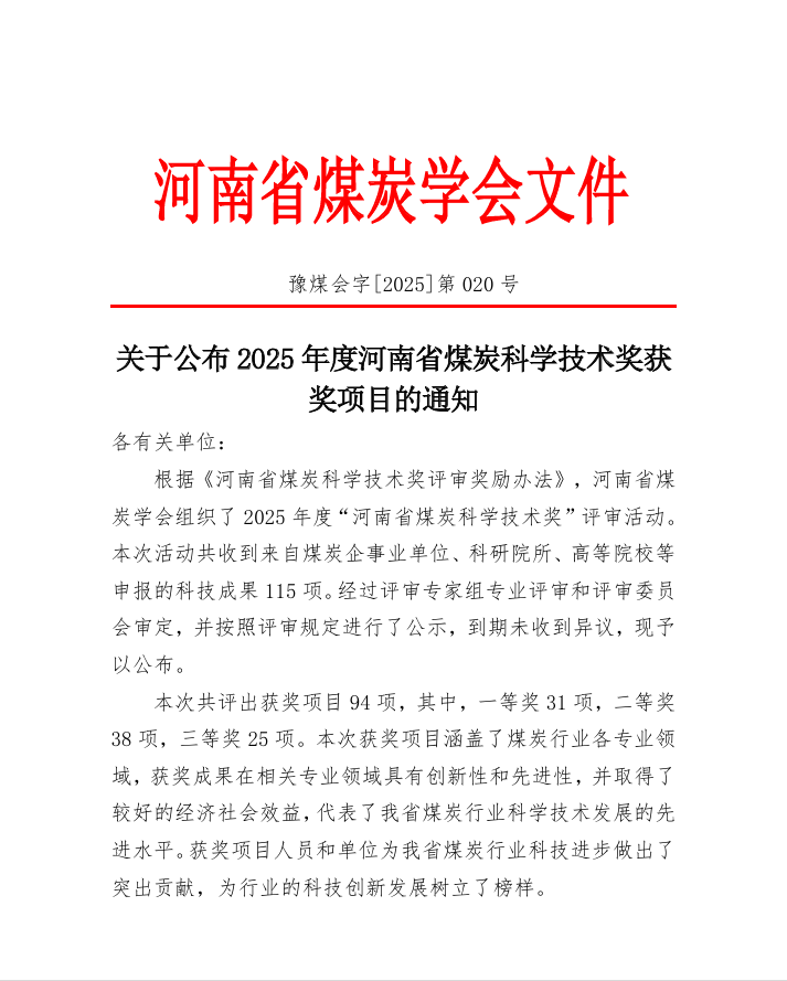 近日,河南省煤炭學會公布了2025年度“河南省煤炭科學技術獎”評審結果。由光力科技牽頭及參與完成的兩項科技成果光榮上榜,榮獲一等獎一項,二等獎一項。